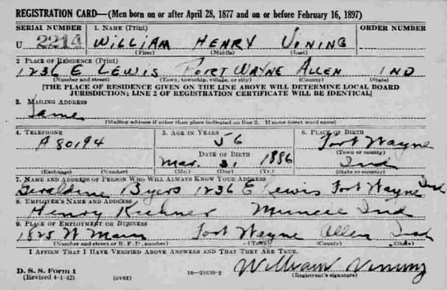 World War II registration card for William Henry Vining.