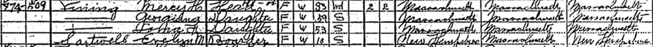 1910 Hanover, Plymouth County, Massachusetts - dwelling 474, family 509. Also living in this household in 1910 was Evelyn M. Sartwell (10 y., b. New Hampshire, boarder).:
