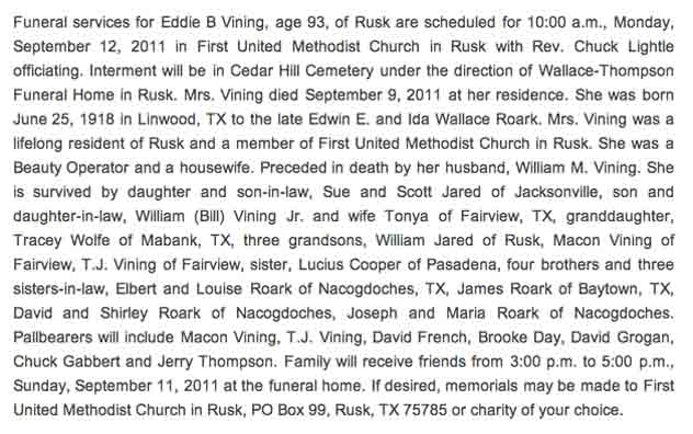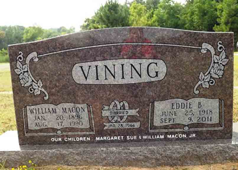 Headstone for William Macon Vining and Eddie B. (Roark) Vining, in Cedar Hill Cemetery, Rusk, Cherokee County, Texas (from Find A Grave):