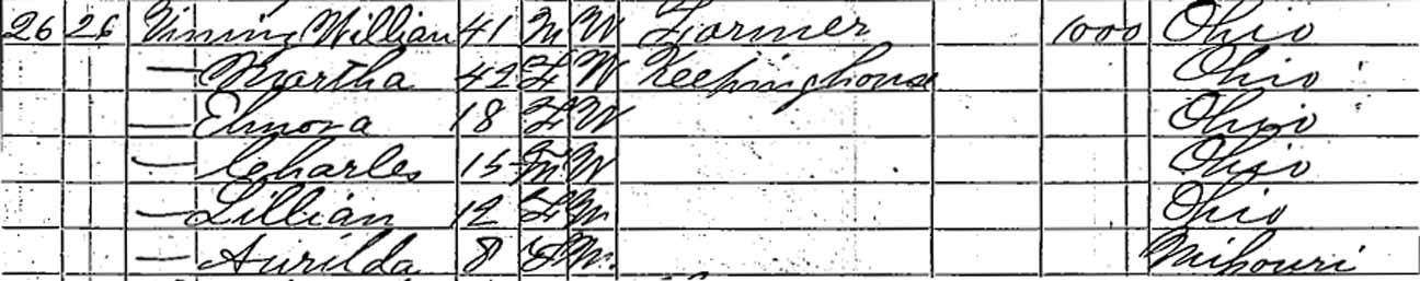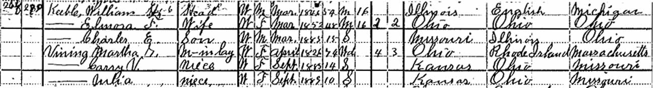 1900 Clay Township, Holt County, Missouri - dwelling 268, family 270. In 1900 Martha G. (May) Vining was living in the household of her daughter, Elnora T. (Vining) Keeble, and son-in-law. Also living in Elnora's household were two orphaned daughters (Carolyn Daisy "Carrie" and Julia) of her brother Charles Oliver Vining.: