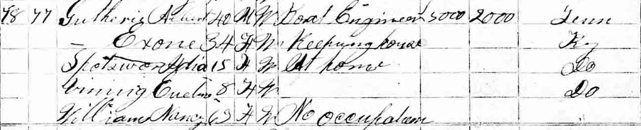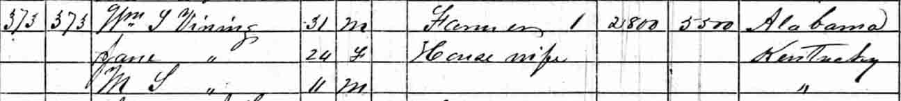 1870 Whetstone Precinct, Cumberland County, Kentucky - dwelling 78, family 77. By 1870, both William Thomas Vining and Jane (Hunter) Vining were dead, and their two surviving children were living in the household of a Gutherie couple.:
