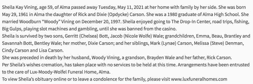 Obituary for Sheila Kay (Carson) Vining (from website of Lux-Moody-Wolfel Funeral Home; Alma, Michigan):